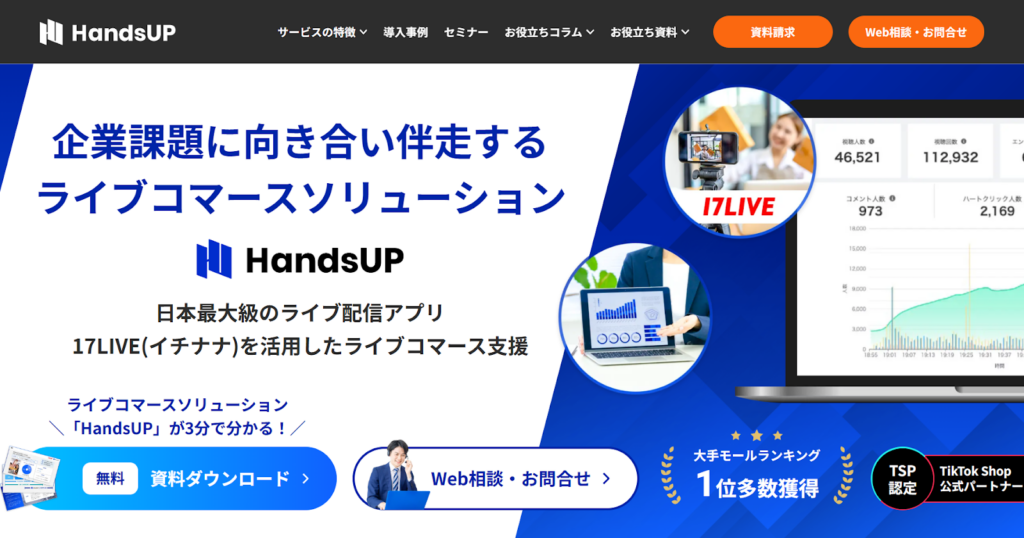 HandsUPは、ライブ配信プラットフォーム 17LIVE を運営する企業が提供する、ライブコマース支援サービスです。