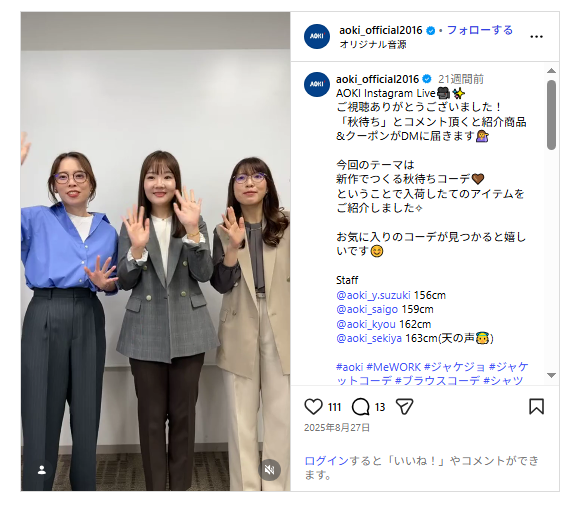 AOKIは、主にInstagram Liveを活用したライブコマース形式の配信を行っています。「秋の新作コーデ」のようなテーマでインスタライブ配信し、スタッフや出演者がアイテム選びのポイントを解説しているのが特徴です。