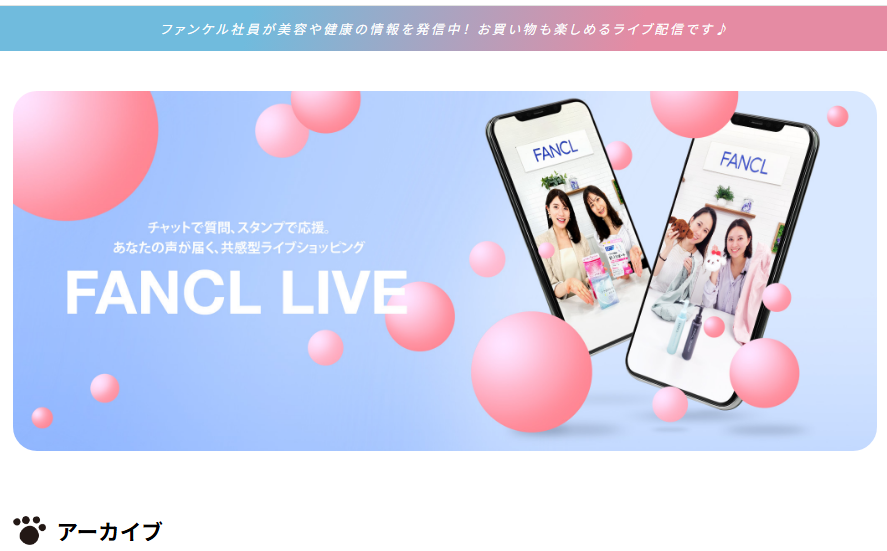 FANCLは公式サイト内にライブ配信機能「FANCL LIVE」を設け、視聴者とコミュニケーションを図りながら商品を紹介しています。