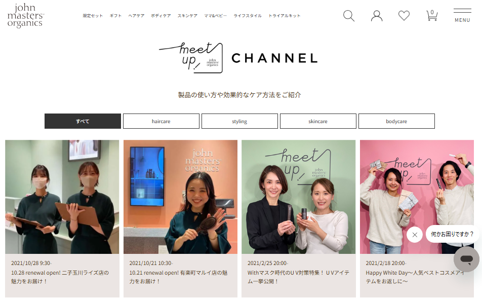 ジョンマスターオーガニックは、公式サイト内にライブ配信ポータルを設け、双方向コミュニケーション機能を活用したライブショッピングを展開しています。製品の原材料や使用方法、組み合わせ提案など、オーガニック製品特有の価値を伝えているのが特徴です。