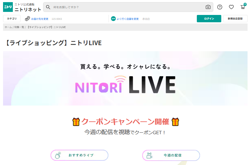 ニトリネットで行われているライブ配信は 「ニトリLIVE」 です。家具・収納用品・生活雑貨などをリアルタイムで紹介しています。視聴者はライブを見ながらコメントで質問できるほか、気になった商品をその場で購入できる機能も備わっています。