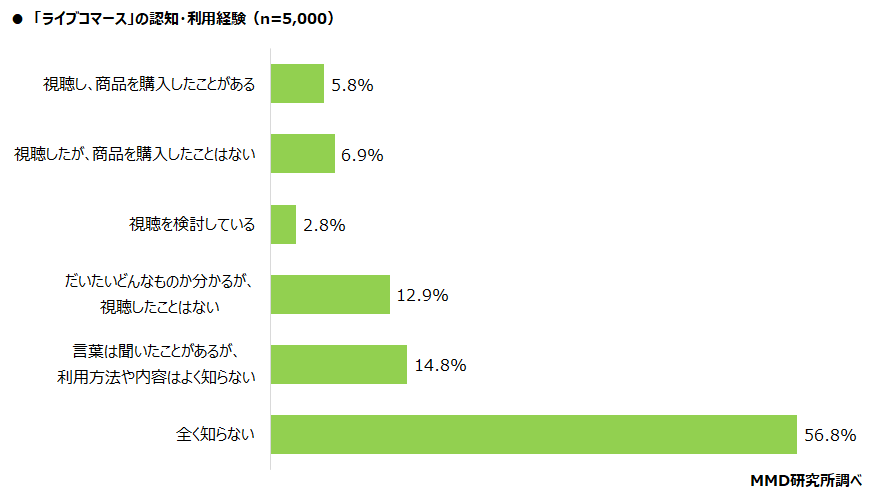 MMD研究所の「ライブコマースに関する利用実態調査」によると、2021年時点で視聴経験者が約12.7%、認知率が約43.2%と、ライブ配信によるショッピングをしていない消費者が多くなっています。