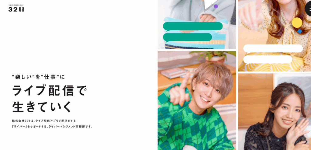 株式会社321は、所属ライバー数が国内最大級の規模を誇る、業界トップクラスのライバーマネジメント事務所です。ライブ配信を中心に活動するクリエイターの育成や支援に特化しており、TikTokをはじめとしたSNSでも存在感を高めています。
