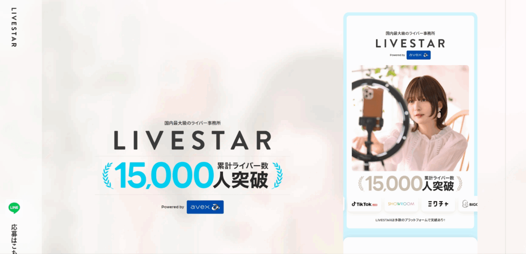 株式会社LIVESTARは、累計15,000名以上のライバーが所属する、国内最大級のライブ配信マネジメント事務所です。TikTok LIVEをはじめ、Pococha、17LIVE、SHOWROOM、BIGO LIVE、IRIAMなど、多くのライブ配信プラットフォームに対応しており、幅広い活動の場が用意されています。