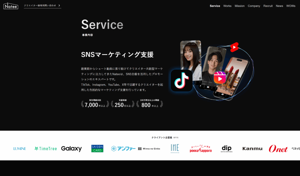 株式会社Nateeは、TikTokをはじめとするショート動画領域に早くから注目し、1万人以上のクリエイターネットワークを築き上げてきたマーケティング支援会社です。TikTok・Instagram・YouTube・Xなど、複数のプラットフォームにまたがって活躍するクリエイターと共に、企業のプロモーション戦略を実現しています。